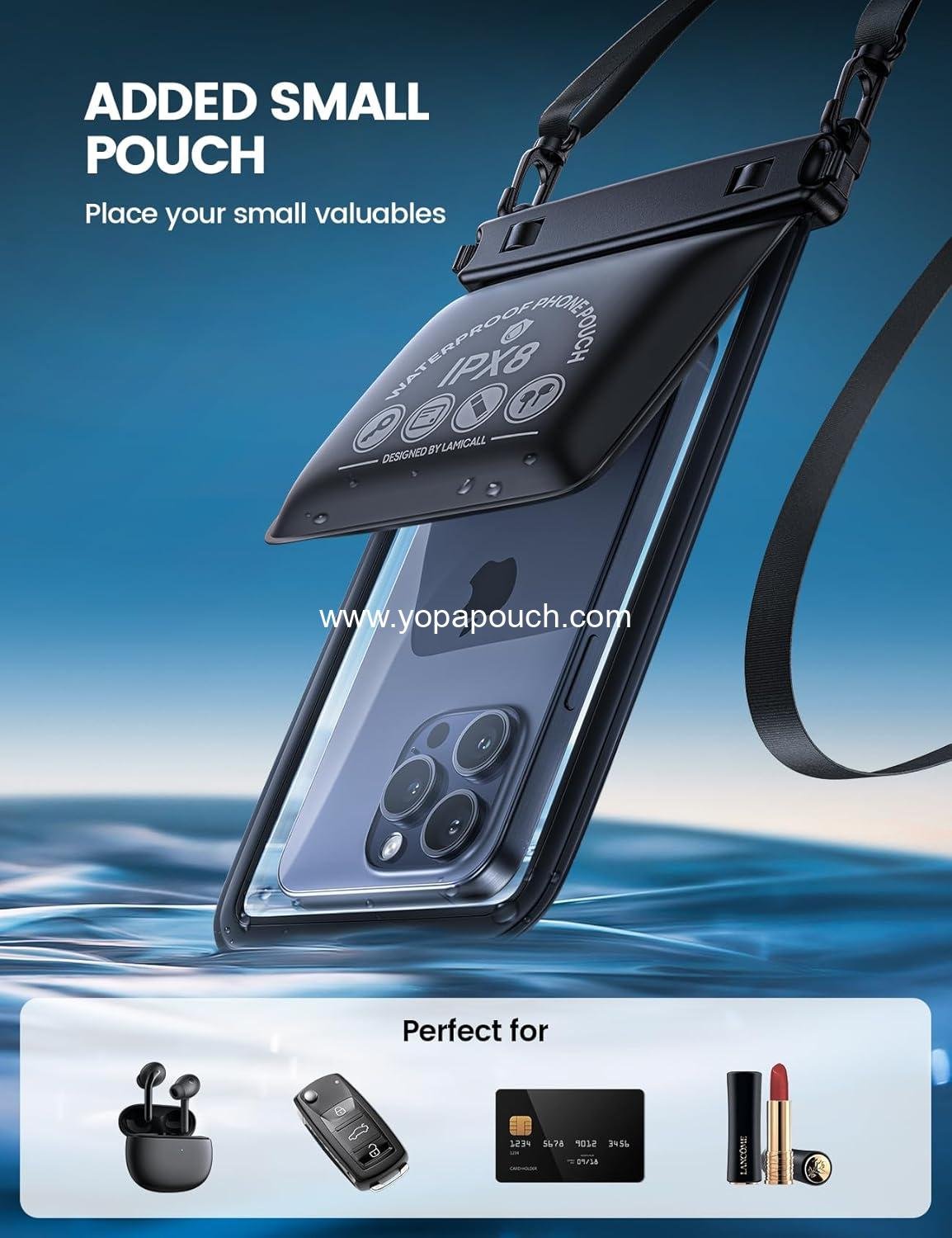 Introducing the perfect accessory for water lovers, our Waterproof Phone Pouch is designed for durability and convenience. This innovative pouch measures 8.3 inches, featuring a double pocket design that includes an additional small bag (3.9 x 4.17 inches), ideal for storing valuables such as cash, keys, bank cards, and lipstick. The separate pocket design ensures that your mobile phone’s lens remains unobstructed, allowing you to capture stunning underwater moments without hassle!